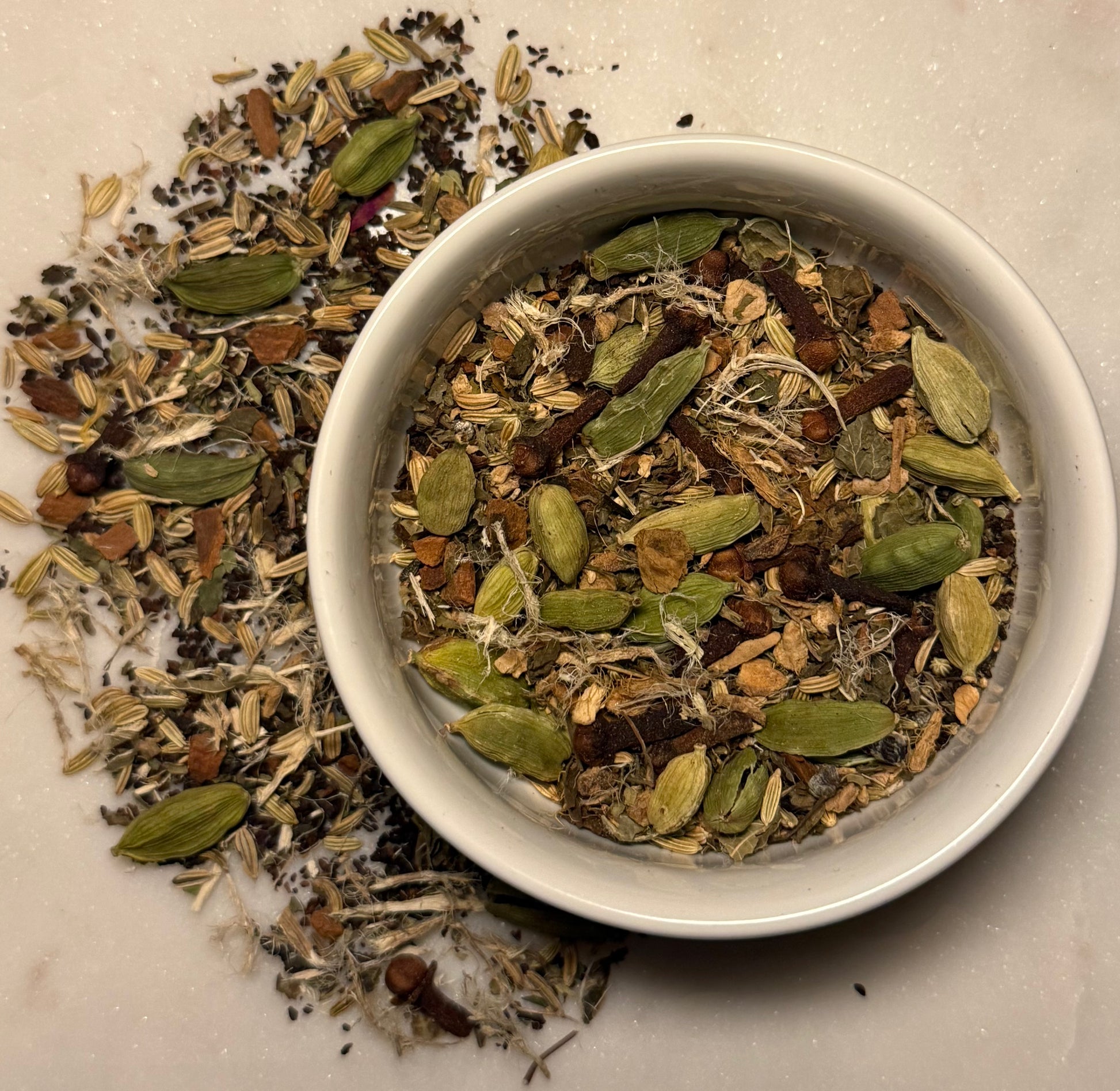 - Warming carminative herbs traditionally used to soothe digestion and ease internal tension